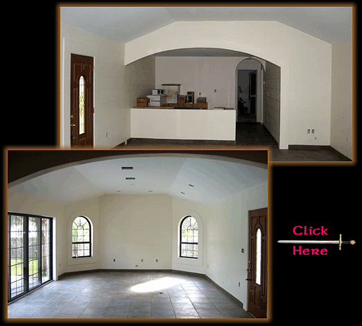 | Here are the walls and ceiling primed and painted. The ceiling is complete and finished in Flat ceiling white. The walls are painted in the Base Coat color of our blocks which is also the color of the Mortar lines. That way we don't have to repaint the Mortar lines. The color choice is yours. The final finish we chose is a 2 step process consisting of a Base color and a Rag off glaze color. They have plenty of Faux finishes to chose from at your local home center. We chose a tan shade. |